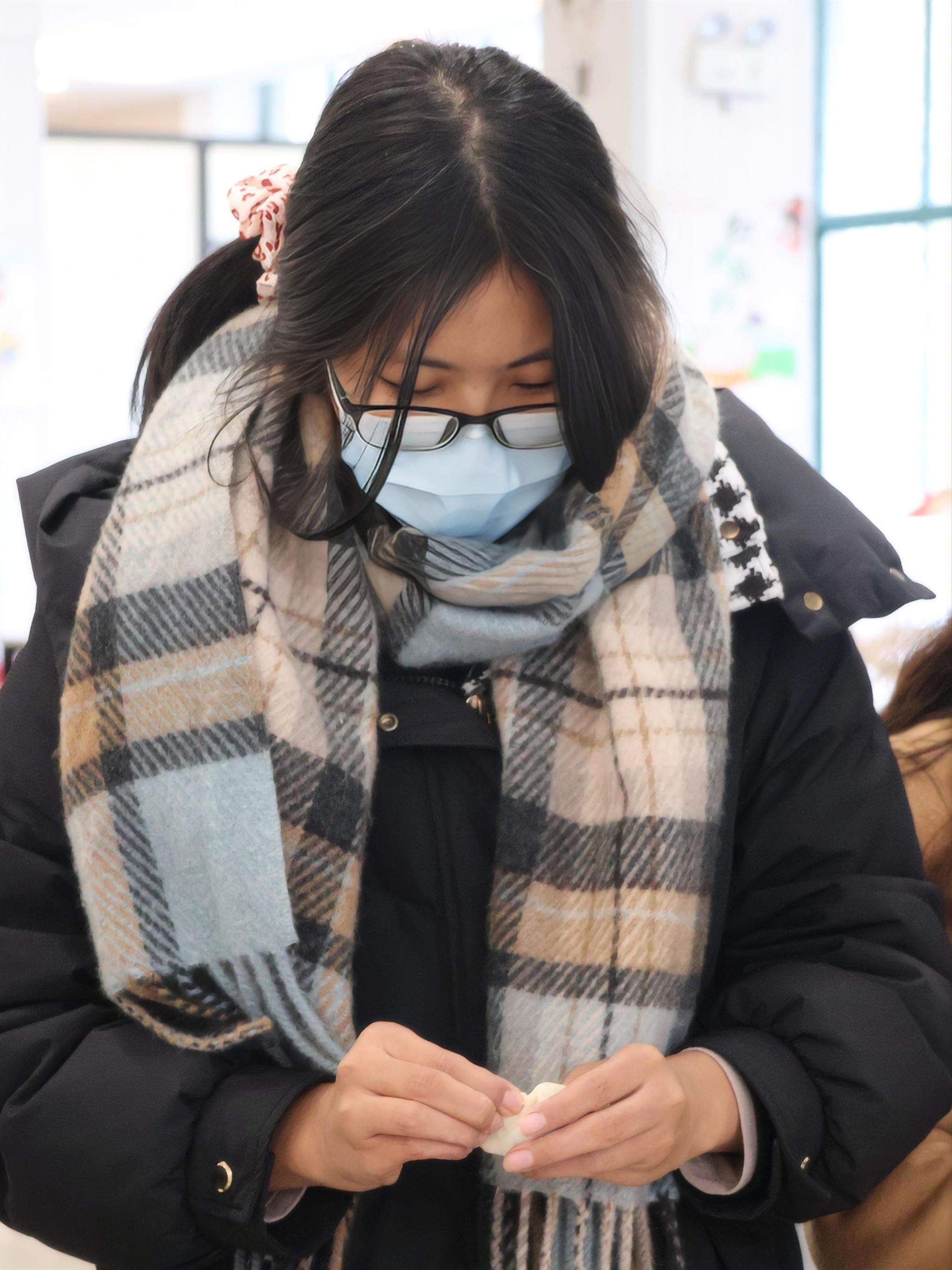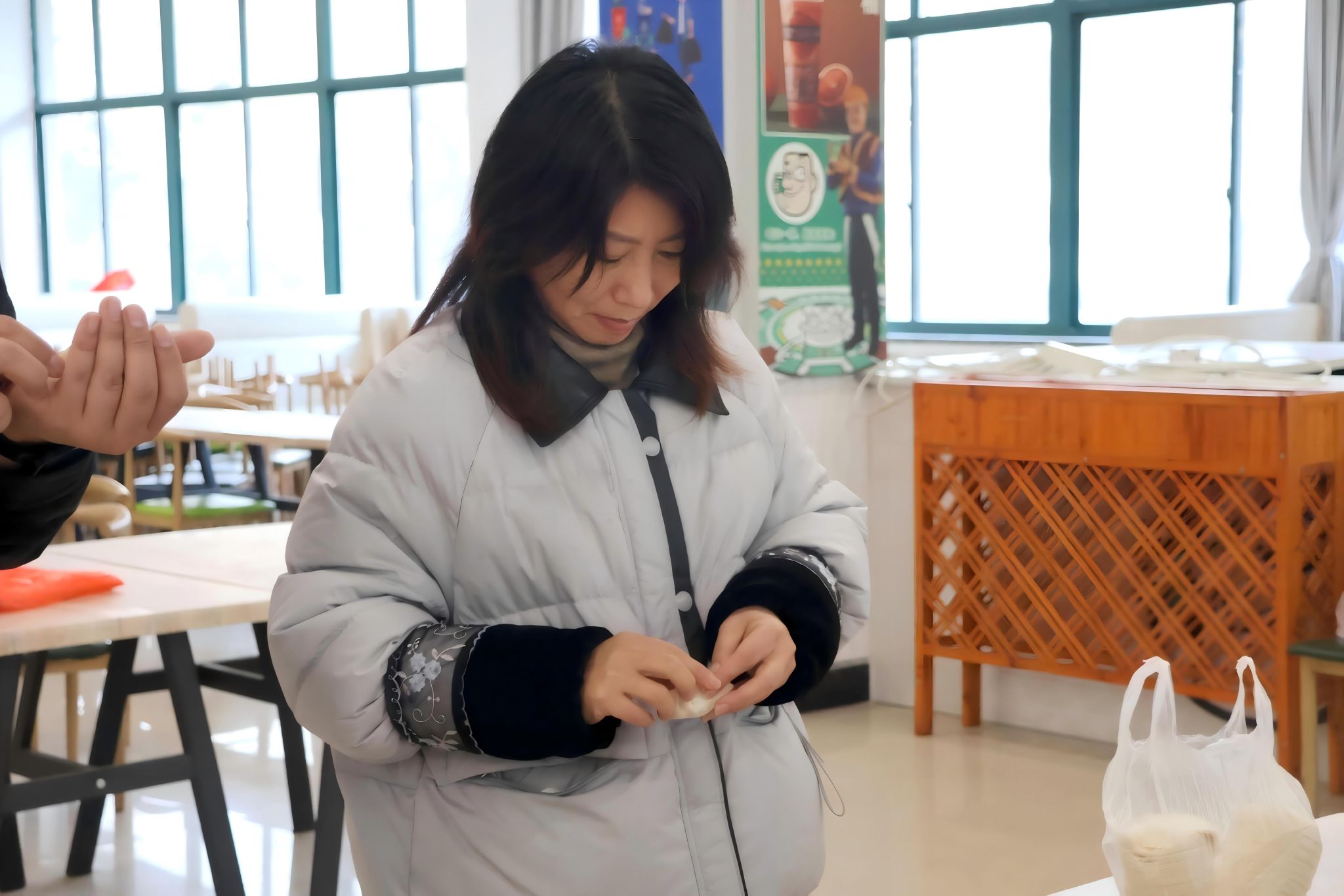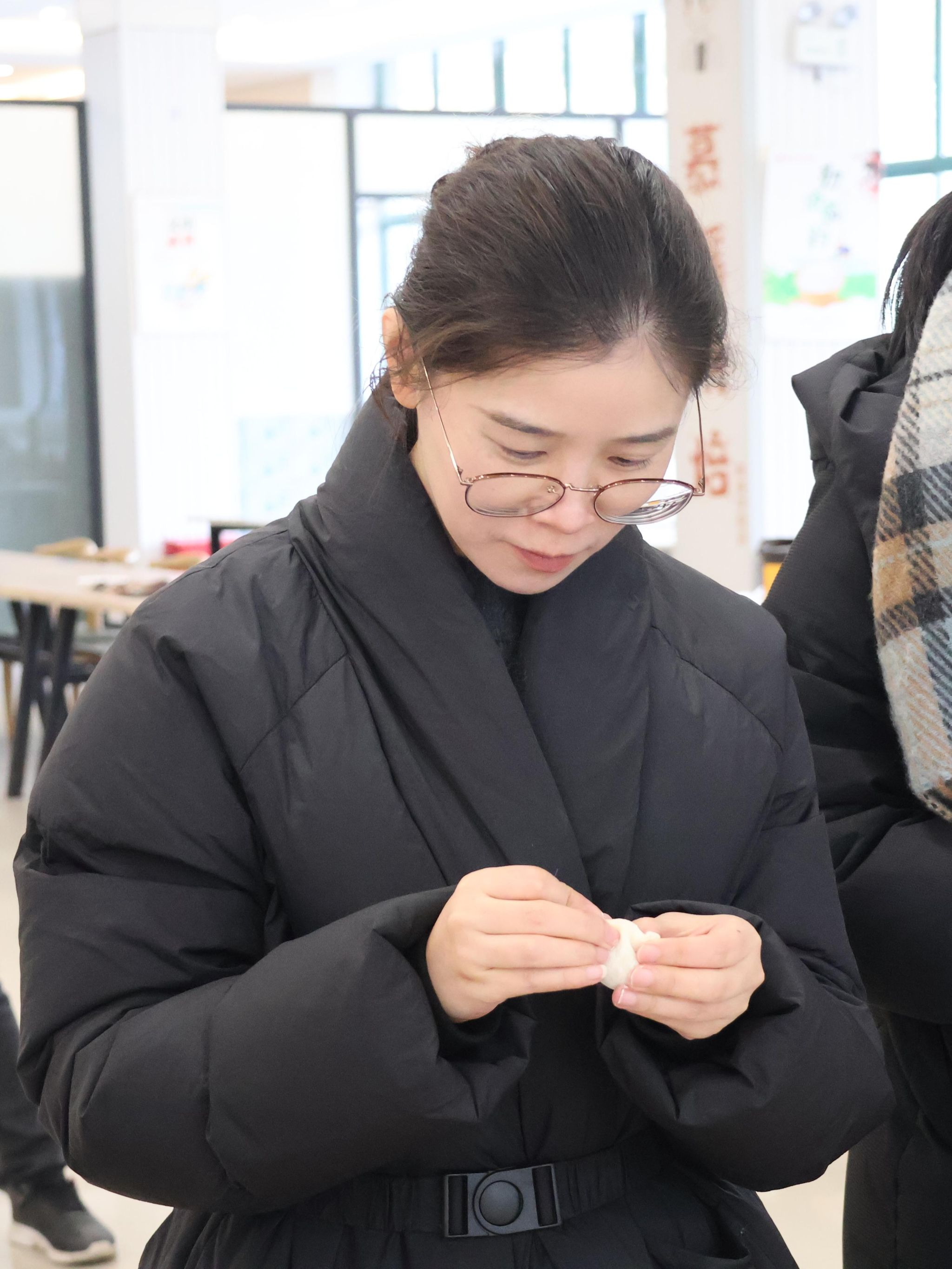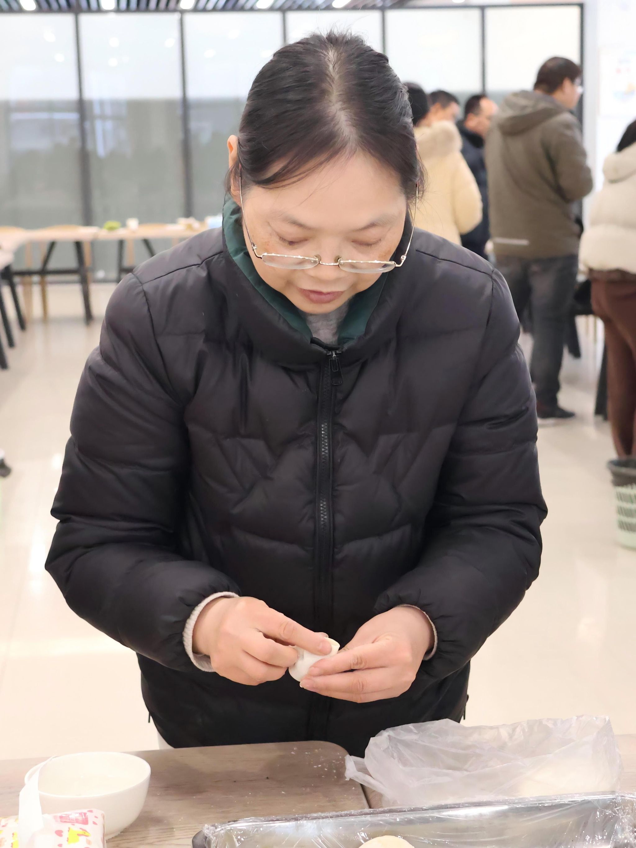 活动现场井然有序,案板、馅料、饺皮等物资准备齐全,节日氛围浓厚。教职工们分工协作、默契配合,和面、擀皮、包馅各展所长。熟练的教职工动作利落,快速包出形态规整的饺子;新手在同事指导下逐步上手,包出的饺子虽样式不一,但均饱含心意。现场欢声笑语不断,充分展现了教职工之间的融洽氛围。